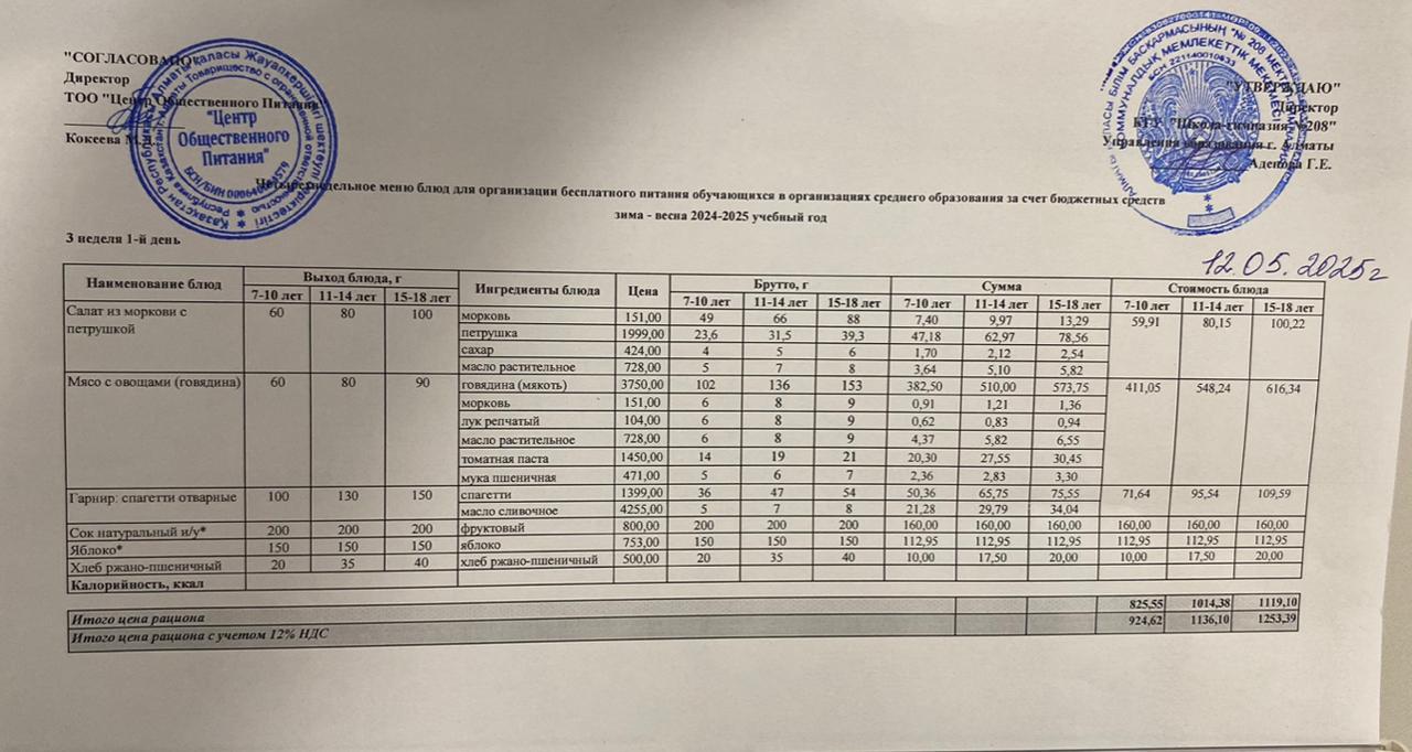 12.05.2025 Асхана мәзірі » №208 мектеп-гимназия
