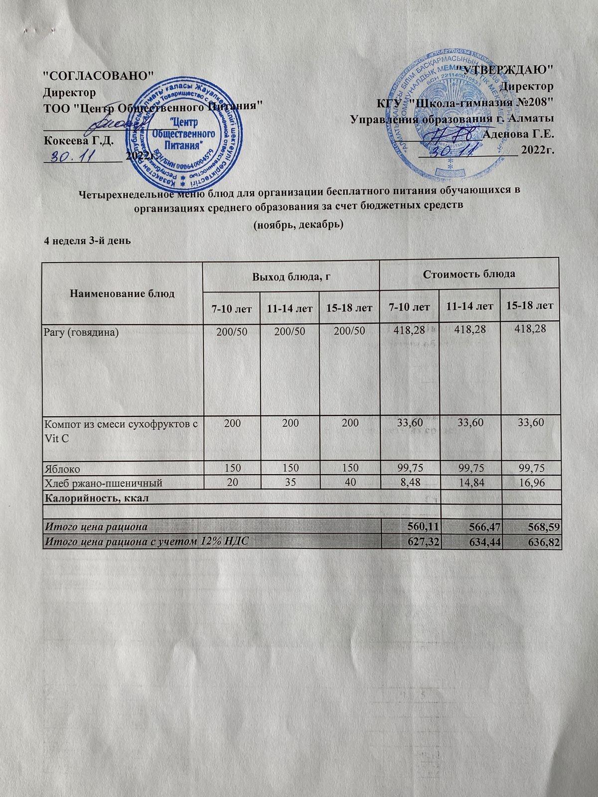 30.11.2022ж Асхана мәзірі » №208 мектеп-гимназия