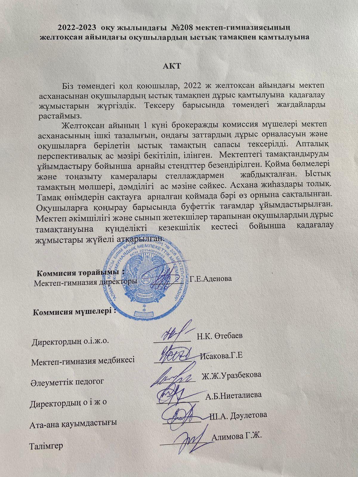 01 желтоқсан 2022 0 1 2 3 4 5 2022-2023 оқу жылындағы №208 мектеп-гимназиясының желтоқсан айындағы оқушылардың ыстық тамақпен қамтылуына АКТ